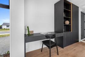 HEART: The striking kitchen showcases rich dark-timber cabinetry complimented by LED lighting and featured shelving, creating a warm yet contemporary aesthetic. A large walk-in pantry and expansive island bench make this a dream space for any home chef, while the open-plan design connects seamlessly to the living and dining zones.